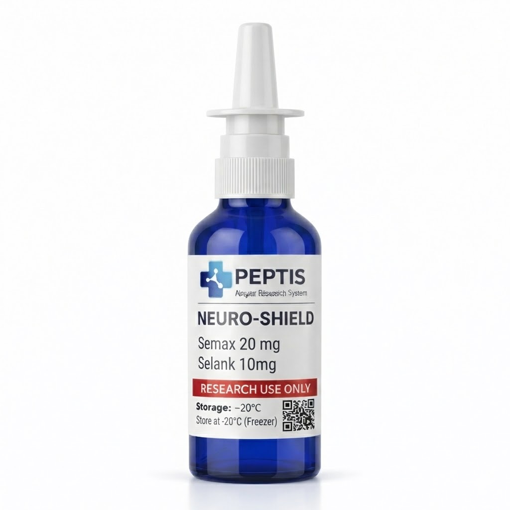 Neuro Shield 30mg (Atomizer). Zaawansowana matryca nootropowa. Bezwzględny złoty standard w badaniach nad neurogenezą i wydolnością kognitywną. Neuro Shield to wysoce precyzyjny, dwuskładnikowy system analityczny łączący stymulujący potencjał Semaxu (20mg) z anksjolitycznymi (przeciwlękowymi) właściwościami Selanku (10mg). W modelach laboratoryjnych matryca ta działa na zasadzie idealnej synergii: Semax radykalnie przyspiesza procesy analityczne i pamięciowe, podczas gdy Selank stabilizuje układ nerwowy, chroniąc badane obiekty przed przebodźcowaniem i stresem.