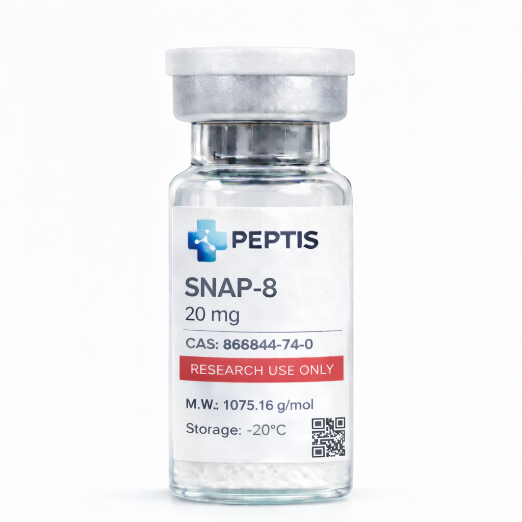 SNAP-8 20mg. Wersja „High Yield” do zaawansowanych formulacji. Podwójna dawka (20mg) w jednej fiolce. SNAP-8 (Acetyl Octapeptide-3) to ewolucja w inżynierii laboratoryjnej i zaawansowany analog Argireliny. W badaniach porównawczych in vitro wykazuje nawet o 30% wyższą skuteczność w analizie redukcji bruzd strukturalnych. Działa poprzez destabilizację kompleksu SNARE, prowadząc do relaksacji włókien bez efektu „maski”. Bezpieczniejsza, odwracalna alternatywa badawcza dla toksyn.
